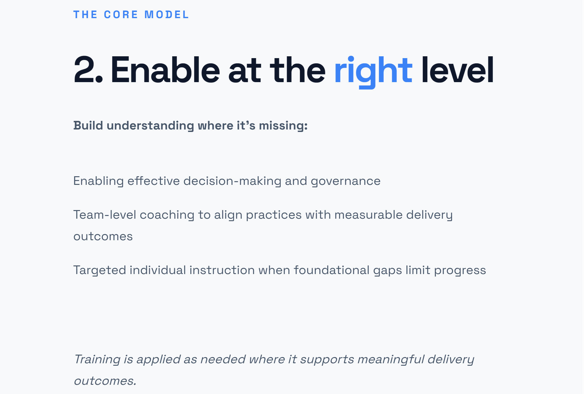 Engagements are tailored to the problem at hand, whether that means diagnosing systemic blockers, enabling teams and leaders, or building durable delivery capability. Work can begin at any level and evolve as clarity emerges. Approaches are often combined as needs shift.