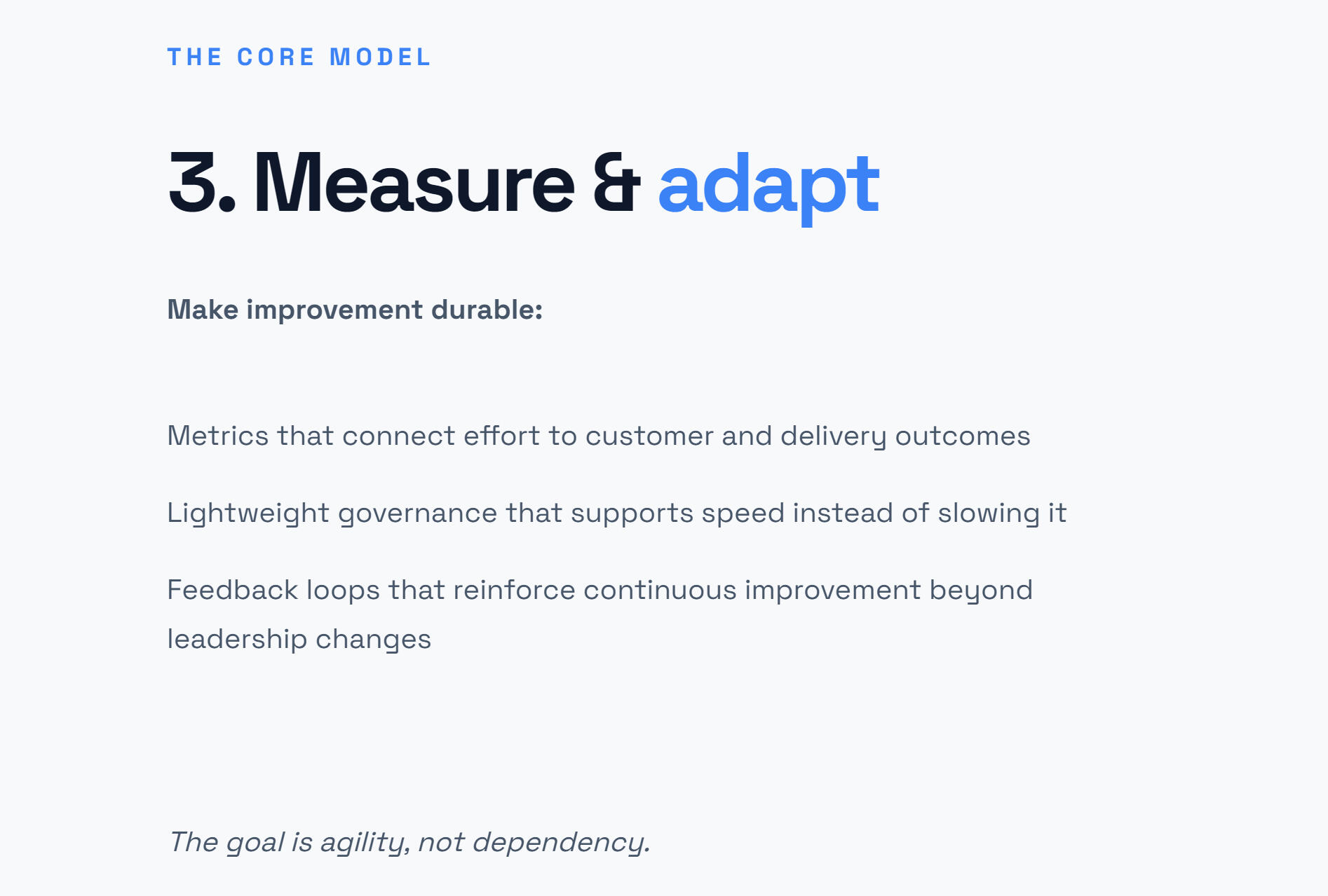 Practical training tied directly to active workBest for: Teams and leaders who want to improve execution without introducing unnecessary process or hierarchy.3. Transformation Support: When Scale & Stability Both Matter Delivery model redesign and rollout